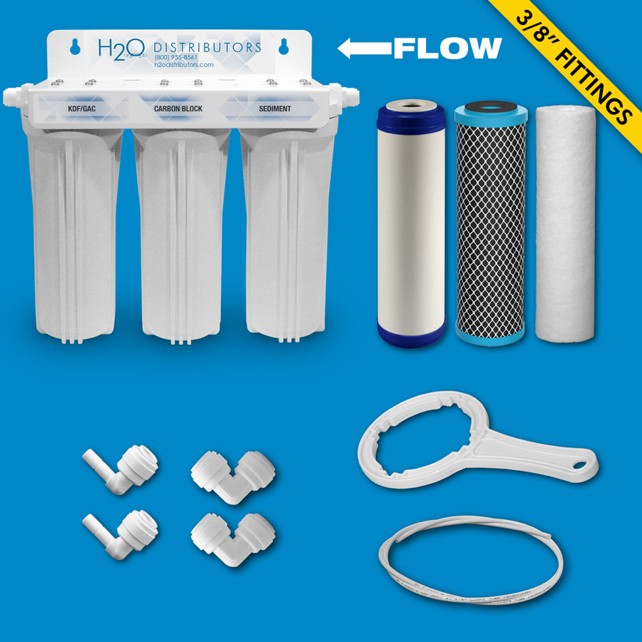 The H2O RUS-300-I, an inline triple housing under-sink filter with the Pentek LR-FB10 cartridge, can be easily installed under any faucet in your home or business.
