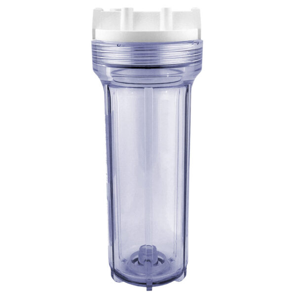 The clear Slim Line 158326 10″ Pentek filter housing with 1/4″ ports accepts 10″ x 2.5″ cartridges.