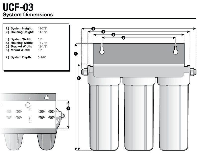 UCF under-sink systems include John Guest Quick-Connect 1/4″ (2) QC to Stem Elbows, John Guest Angle Stop Adaptor, John Guest 1/4″ Tubing, Housing Wrench, and Bracket.