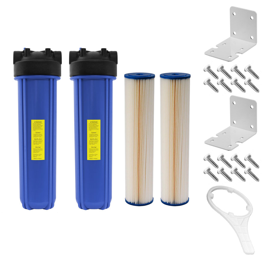 Dual 20″ x 4-1/2″ Black 5 Micron Sediment Filter Kit for UV Light Sterilizer 1″ Ports System Included Parts: